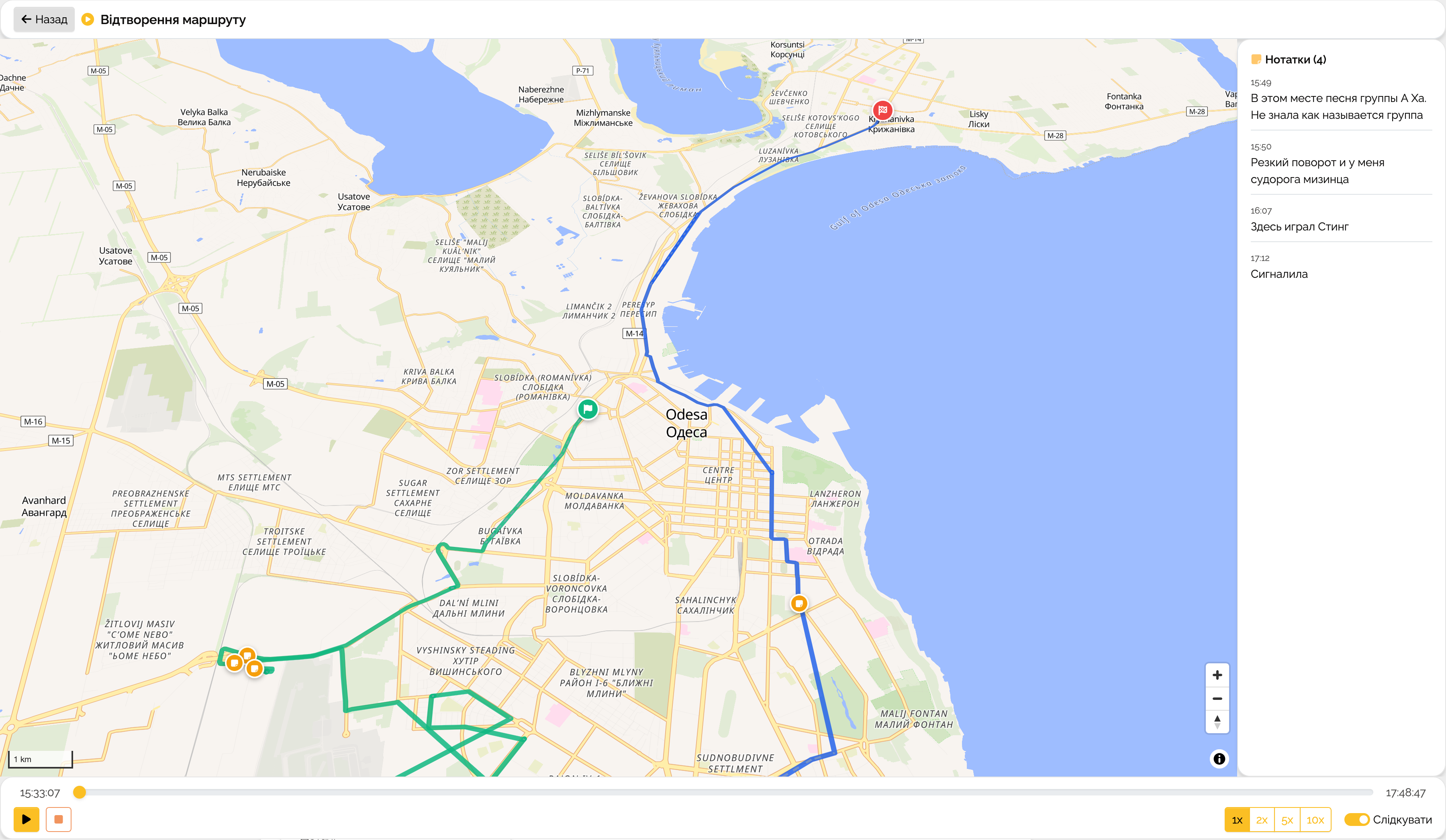 Відстеження маршруту в реальному часі під час заняття, запис сесій з картою, відтворення маршрутів та аналіз ефективності кожного уроку.
