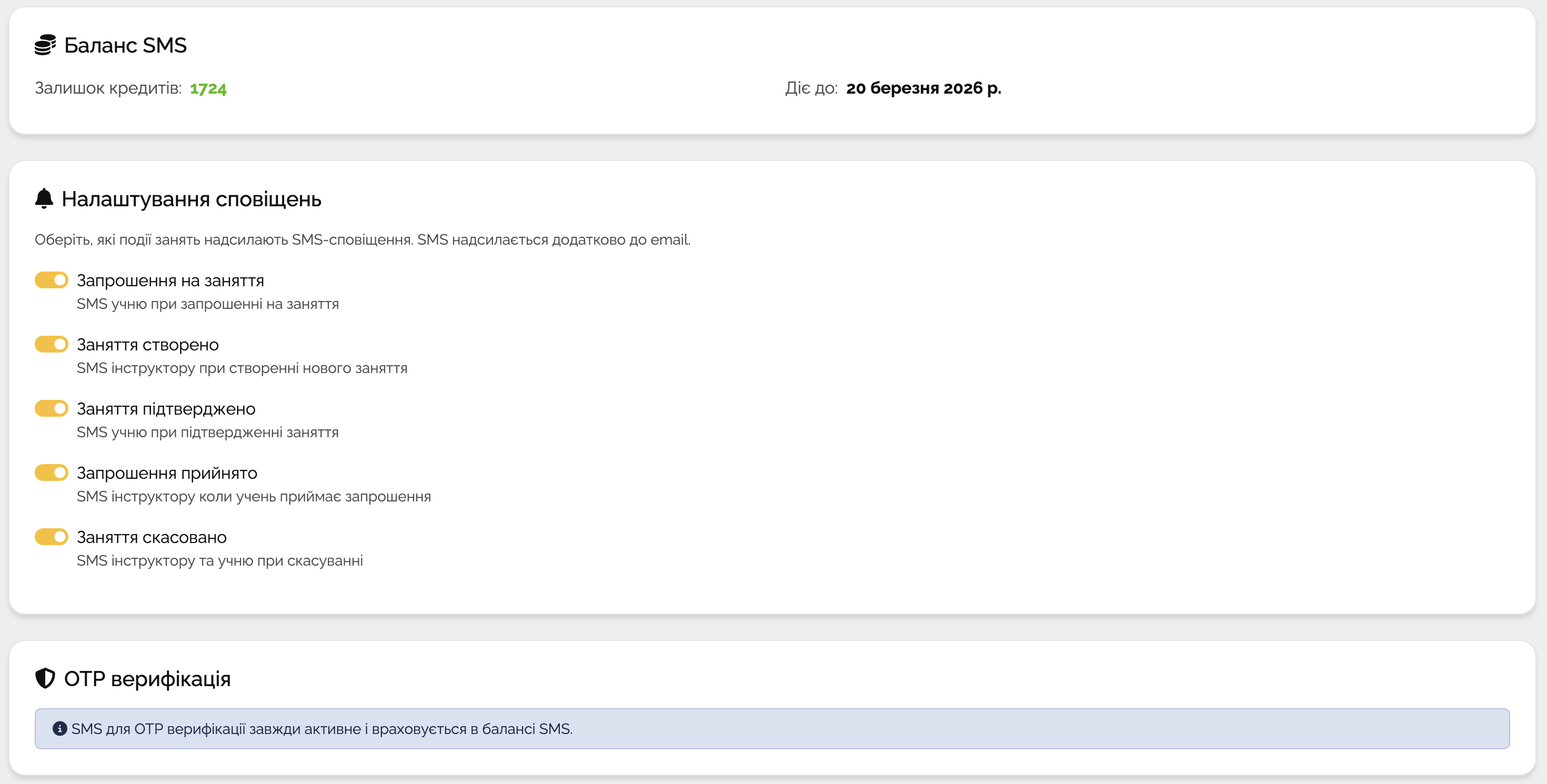 Автоматичні нагадування про заняття, підтвердження бронювань та власні розсилки. Ціна за SMS залежить від вашого тарифу.