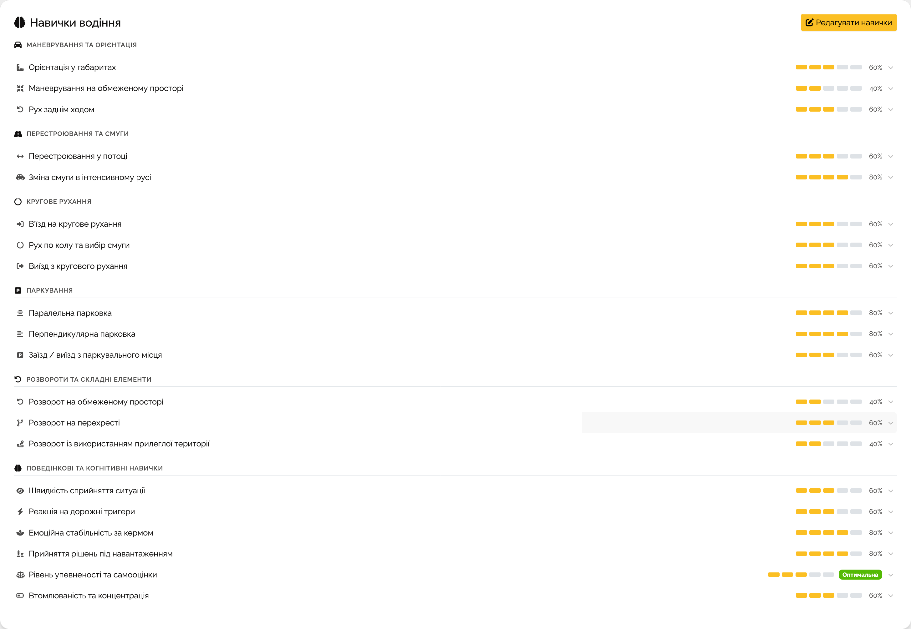 Система навичок дозволяє фіксувати прогрес за категоріями, переглядати історію занять та формувати звіти успішності для кожного учня.