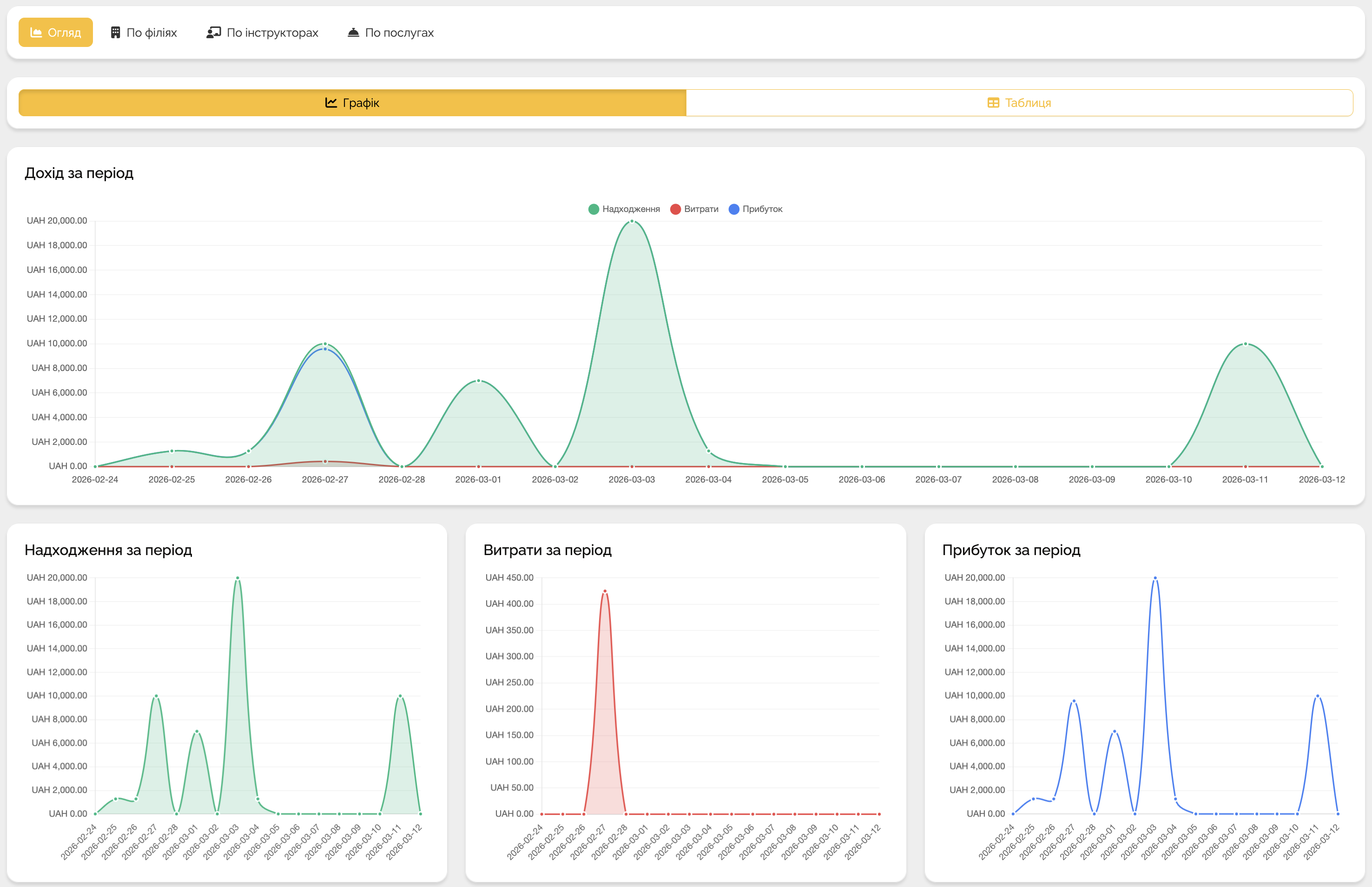 Кожна філія має власний розклад, інструкторів та автопарк, але фінанси та звітність доступні централізовано. Адміністратори можуть бути прив'язані до окремих філій або мати доступ до всіх — повна прозорість та контроль.