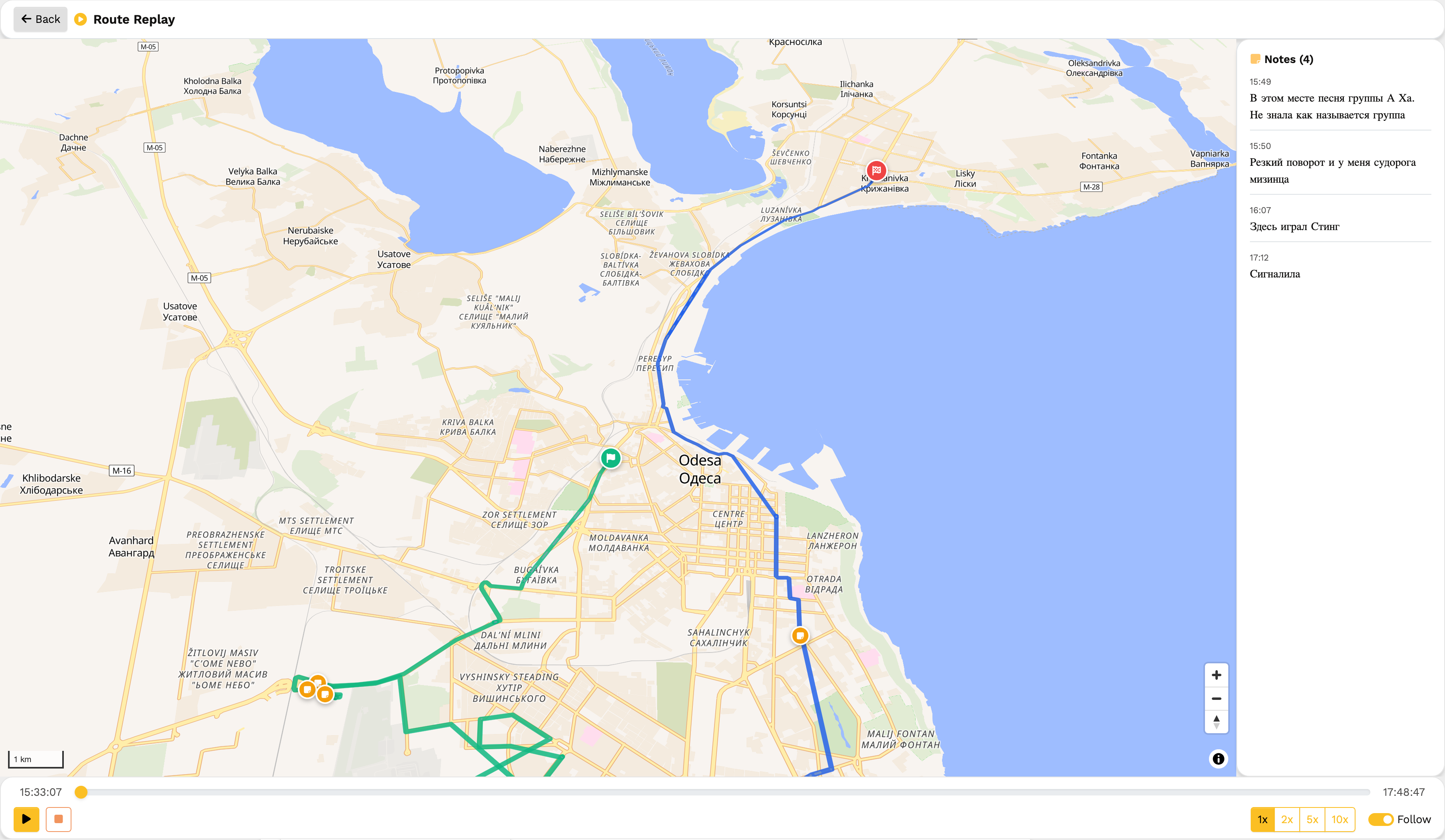 Відстеження маршруту в реальному часі під час заняття, запис сесій з картою, відтворення маршрутів та аналіз ефективності кожного уроку.