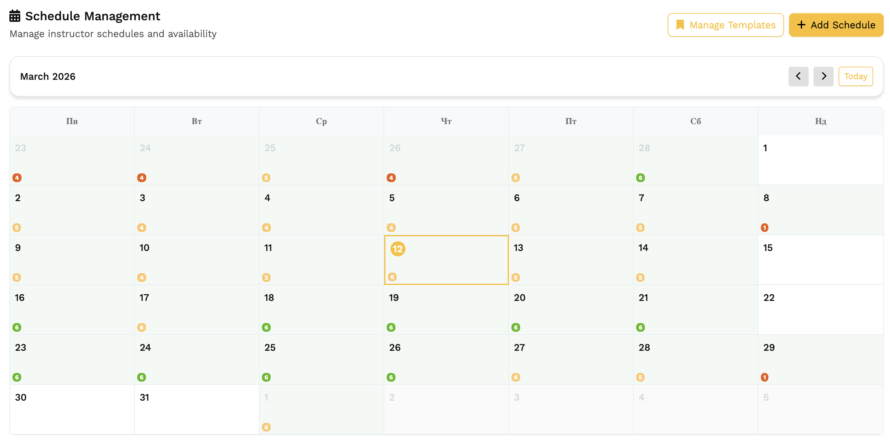 Інструктори бачать свій розклад у візуальному календарі, керують доступністю та отримують сповіщення про нові бронювання. Все з телефону або комп'ютера.