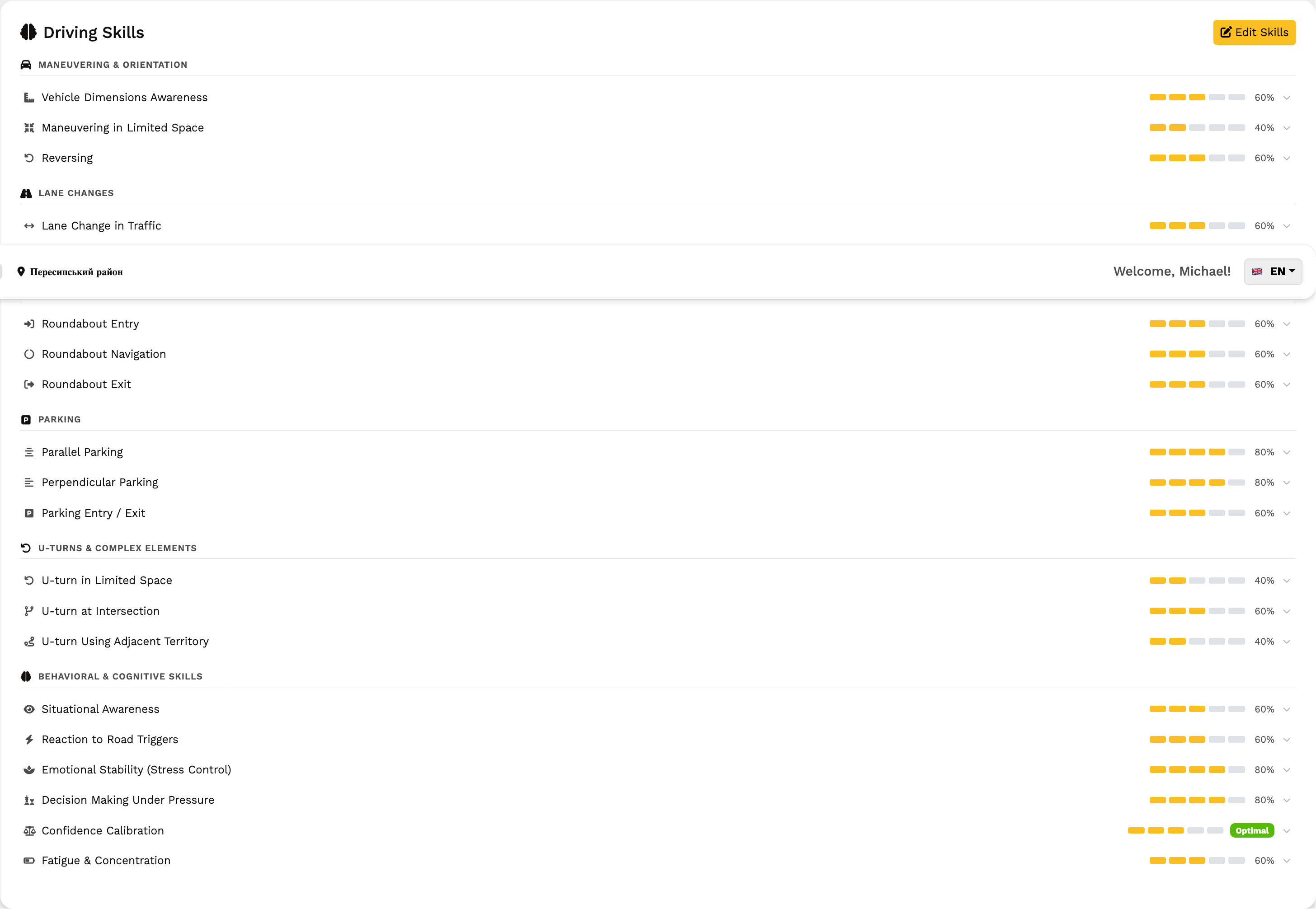 Система навичок дозволяє фіксувати прогрес за категоріями, переглядати історію занять та формувати звіти успішності для кожного учня.